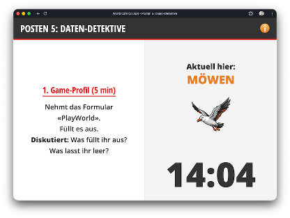 - Analoge Arbeit: Die Schülerinnen und Schüler arbeiten an gewissen Posten weiterhin mit Papier, Stift etc. Die Posten-Screens dienen lediglich als Stoppuhren, als «Auftragsblätter» und Orientierung bei Wechselphasen.